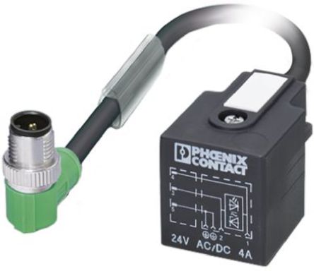 A range of A-coded M12 3 way female and male connectors complete with PUR halogen free cable, in orange or black, terminating at a valve connector with a selection of valve types (A,B,CI). Some models have Indicator LED , connected with a a Z diode.